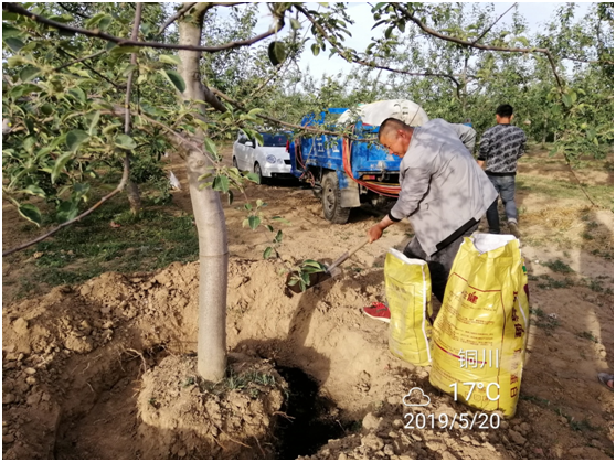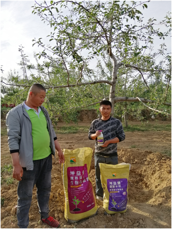 使用方法:从苹果树树冠滴水线开始往树干处开沟,见到根为止,去除腐烂的根系,使用坤益健腐熟蛋白生物有机肥20斤配合坤益健调酸补钙2斤均匀撒施在施肥沟里,和土搅拌均匀,再使用坤益健100菌剂100ml兑水30-50斤,进行浇灌,然后覆土。