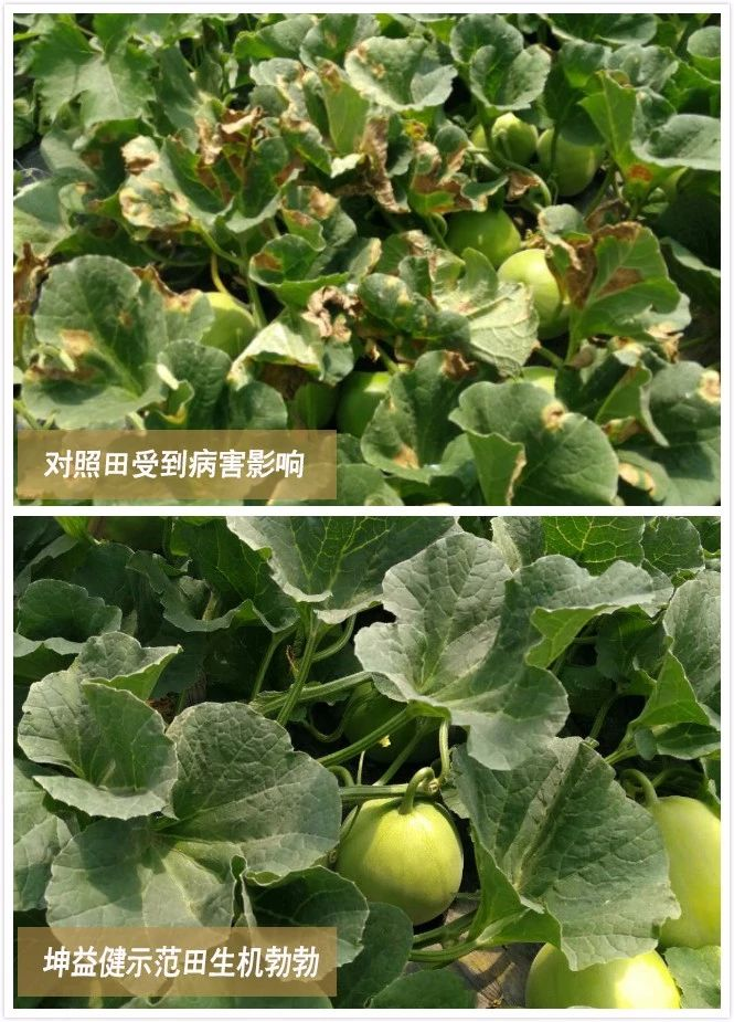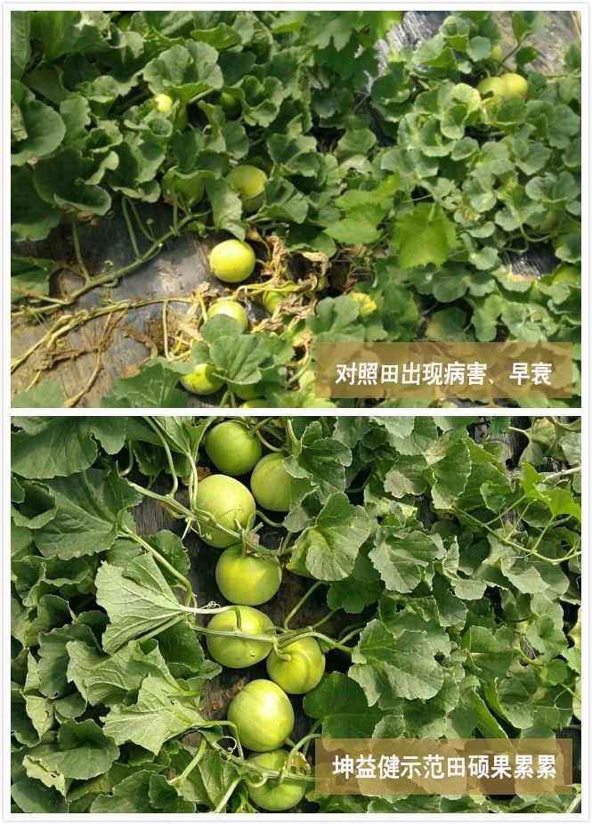 使用效果: 使用坤益健菌剂后,土壤无板结硬块,甜瓜主根粗壮,分布均匀,毛细根多,PH值由4.5升至5.2,叶片大,浓绿,果型均匀,糖度到13%(产区内“田宝”正常糖度为11-12%),试验设的对照棚因大部分早衰死棵,村邻的还有没收获的,病害早衰严重。